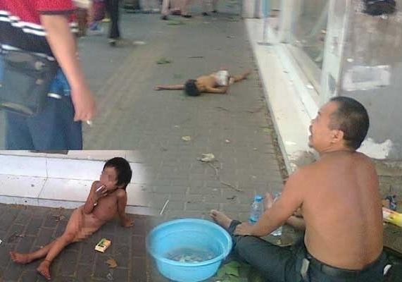 7月2日下午,微博上一条小女孩赤身躺在南京马路边的照片,引起了极大的社会关注。昨天上午记者再次来到网友见到小女孩的地方,巧合的是,她正坐在路边乞讨,身旁还跪着一个赤膊的中年男人。面对市民的指责以及救助站社工的询问,男子不作任何解释,只是不断重复着“这是我的孩子,我不需要救助”。(7月4日 光明网)