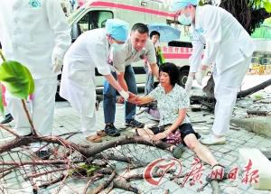7月3日,广州东湖西路一棵大叶榕老树断裂落下一根大树干,砸中60岁阿婆的肩部,导致骨折和脱臼。