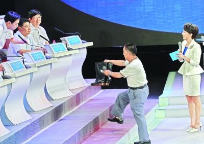 直播现场的市民代表给水务部门领导“赠送”雨鞋,以提醒职能部门关注城市居民区渍水现象 记者 傅克强 摄