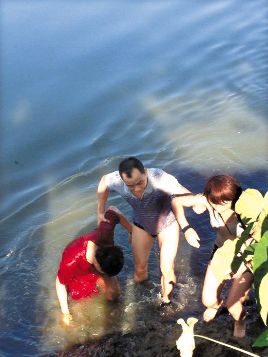 梁国庭只用了3分钟就到达了现场,他发现在桥下有两女一男共3人正在河里挣扎。“你们快先上来,下面好危险,有什么上来好好说,我们帮忙解决!”情况危急,他边大声劝说河中三人上岸,边赶紧脱下长裤准备下水。眼见有人前来救人,水中一女子(夏某)很快游上岸,河中其余两人依然在水中挣扎,不愿意上岸。