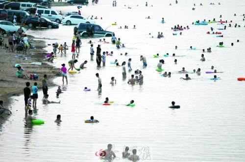 采访时,记者发现龙湖几乎成了免费“浴场”,成千上万的市民纷至沓来,道路几近堵塞。湖岸线上,有数千名市民前来戏水,有市民甚至将越野车开到湖里,进行冲洗。