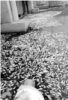 上塘河是流经杭州城区的一条城市内河,在余杭临平、南苑一带成西向东走向流入海宁许村。在余杭和海宁交界段的河道上有一个防洪水闸,闸口前有段长势茂盛的水草,发现大面积死鱼的地点就在水草丛的西面。小鱼成片翻肚浮在水面,目测有两三千条,渔政部门的人捞上来一看,都是3~5厘米不等的鲫鱼苗。
