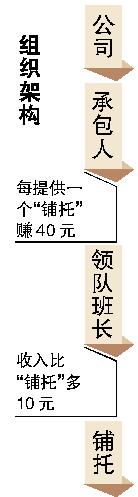 “我们每天都只能见到班长,承包人、顶层公司负责人只是听说,从来没有见过。”廖志成说,其中,班长负责组织联络,每天只比铺托多挣10元。班长一般由做‘铺托’时间较长、有一定组织能力的人来担任。