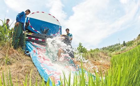 爱心企业伟诺机电有限公司抽调了4台储水车,每天在望城茶亭水库取水1000吨,运送到旱情最为严重的村组。图为储水车在狮子岭村燕山组浇灌农田。李锋 摄