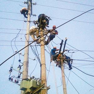 电力工人爬上电杆抢修受损线路 记者 李长江 摄