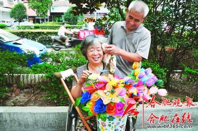 在城隍庙附近,许多人常常看到这样一幕,一位坐在轮椅上的老太太捧着一大桶做好的绢花,她的老伴则默默地站在旁边为她扇风、撑伞。从2009年至今,整整4年的时间,两人互相关爱的场景成为街边一道亮丽的风景线。