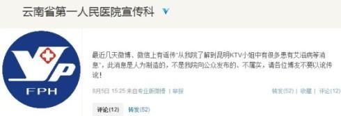 云南省第一人民医院又称“昆华医院”,5日,它的官方微博“云南省第一人民医院宣传科”也发布信息称:“最近几天微博、微信上有谣传‘从我院了解到昆明KTV小姐中有很多患有艾滋病等消息’,此消息是人为制造的,不是我院向公众发布的、不属实,请各位博友不要以讹传讹!”