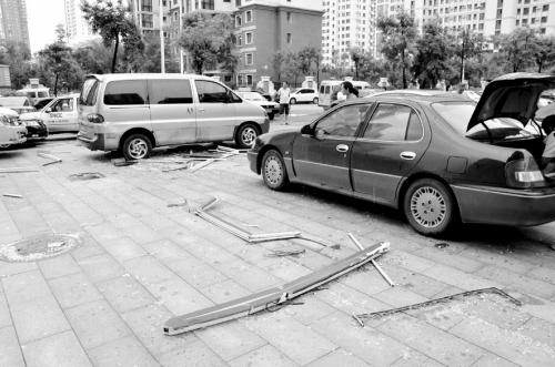 昨日早7时30分,沈阳晚报、沈阳网记者赶到事发现场时,被砸中的多辆私家车仍停在该小区东门外的停车场,受损车辆周围到处都是玻璃和塑钢窗的碎片。