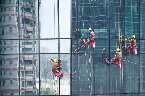 城市“蜘蛛人”在为天河一幢高楼洗玻璃外墙