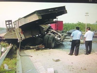 昨天,一名交管人士告诉扬子晚报记者,初步判断是货车前轮突然爆胎导致失控,并撞向护栏。