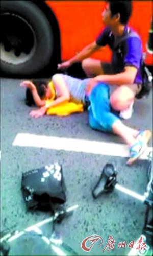 视频字幕交代:8月20日下午6时许,佛山禅城区人民路一小车撞人后逃逸。记者从视频上看到,一年轻女子倒在路中间,表情痛苦,附近躺着一辆自行车。女子身后蹲着一男子,张开双手作保护状,防止伤者受到二次伤害。一辆公交车途经此处,男子便挡在伤者与公交车之间,避免伤者再次被撞。公交车几乎与男子“擦身而过”,两者距离不到20厘米。