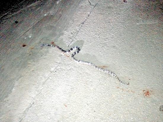 黄先生说,自己看到这条蛇时,它已经躺在路边动也不动,过往的车辆来来往往,将它压过。旁边一名中年男子看到有居民出现,连称“你们小区有蛇,小心”。该男子说,他是附近的村民,他亲眼所见这条蛇从雅怡花园小区的绿化树丛里钻出来,爬到侧门的铁门缝蜿蜒而下,往马路方向爬行,他立即用随身带着的铁锹把蛇打死。“那个村民跟我说,一看就是条毒蛇,很危险。”