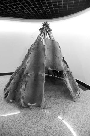 继续往前走,在鄂伦春族展区内,一个类似帐篷的东西也比较吸引人眼球,只是它全部用狍子皮围挡着。经了解它叫“斜仁柱”或者“仙人柱”,是鄂伦春等游猎民族较为原始的住房。