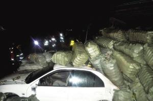 2日晚,黄平县境内,一辆大货车行驶中侧翻,车头压住一辆同行面包车,运载的啤酒瓶又将后方驶来的小轿车掩埋。事发后,面包车起火燃烧,车上4人死亡。