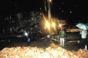 据介绍,当晚20时许,事故发生于凯施公路黄平县重安镇马场村一长下坡路段。黄平消防官兵赶到现场看到,侧翻货车车头压着一辆面包车,货车上滚落下来的啤酒瓶将一辆小轿车掩埋,面包车内有人被困。此时,大货车车头位置和面包车正燃着熊熊大火,消防官兵迅速出动水枪灭火。