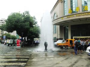 当日上午10:20分,记者在现场看到,从损坏处地面喷出的水约有5米多高,维修人员正在现场处理损坏的消防栓。10:27分,水势被控制。而此时,距离开始喷水已过去50分钟。