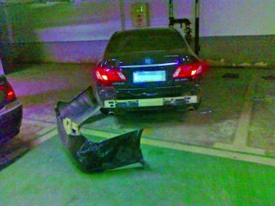 目击者吴先生说,当天晚上7点左右,他从六合紫晶购物广场二楼的苏果超市购物结束后,去地下停车场取车,还没走到自家车辆前,突然听见“嘭”的一声响,只见一辆白色轿车撞上了停在前方的一辆黑色轿车车尾,导致黑色轿车后保险杠脱落。