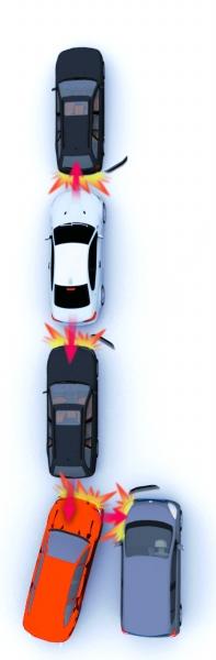 这次冲击力较大,被撞的黑色轿车发生移位,顶向第四排的一辆红色轿车。被牵连的红色轿车在惯性下又撞向右方的黑色越野车,红色轿车车头变形,保险杠断裂卡在越野车的轮胎中间,被波及的黑色越野车的车门也凹陷变形。