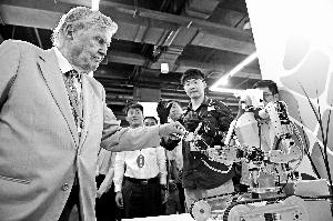 昨天在首图诺贝尔奖主题展上,诺奖获得者罗伯特·蒙代尔与市民互动。晨报记者 郝笑天/摄