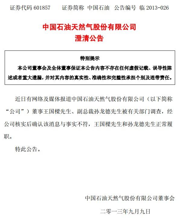 9日,上交所公告称:“近日有网络及媒体报道中国石油天然气股份有限公司(以下简称‘公司’)董事王国樑先生、副总裁孙龙德先生被有关部门调查,经公司核实后确认该消息与事实不符,王国樑先生和孙龙德先生正常履职。特此公告。”