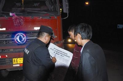 几分钟后,执法车前往下一个巡查地点。“前面的车靠边停下来,请配合我们的工作。”21时34分,执法人员向一辆正在行驶的青A牌号的“渣土车”发出了紧急停车讯息。随即,执法人员对这辆车做了检查。执法人员得知,这辆车已接到通告,但还是向司机耐心讲解了通告内容。同时,督促司机尽快办理相应的车辆密闭改装手续。