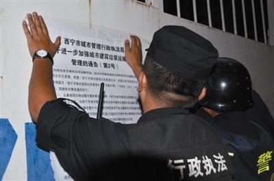 21时30分,当执法车行至宁张路时,执法人员停下车,随即从车里取出一张《西宁市城市管理行政执法局关于进一步加强城市建筑垃圾运输处理管理的通告》。几名执法人员将通告贴在了宁张路上一家建筑工地的大门上。牛海军说,这家工地已经接到了通知,在大门外贴上通告,是为了提醒施工单位尽快办理车辆密闭改装的相关手续。