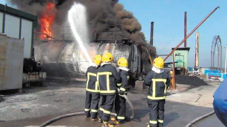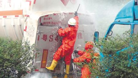 ←消防人员通过水枪对槽罐车喷水降温,防止爆炸。