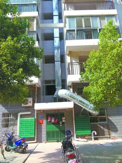 “未经居民同意,一个高达30多米的烟囱,竟然贴着13层的居民楼道安装排放(如图),而这样的排放方式,竟然还得到环保部门认可。”昨天,家住蔡甸大街惠民新居小区的黄先生,联合13户居民向本报反映。