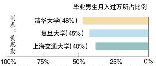根据对会员个人资料登记情况的统计分析,毕业单身男性收入过万排名前三的高校分别为清华大学、复旦大学、上海交通大学。清华大学毕业单身男高居综合经济实力排行榜第一名,成为名副其实的“钻石王老五”盛产地。