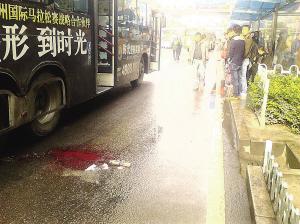 事发城关区庆阳路双城门公交车站,老人正在接受手术治疗6旬老人下车瞬间公交竟从腿上碾过 事发现场残留血迹 窦文杰摄