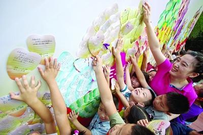 早在几天前,南京莲花实验学校校长李建华就在琢磨怎样过教师节。李校长精心制作了一面墙,主题是“我秀我心”,造型是一朵盛开莲花上的心。“今天的教师节只是一个起点,以后‘我秀我心’墙每天都会放在校园里,它会是孩子们展现和表达的小小窗口,表达他们对学校的意见和建议。”校长李建华自己也在这面墙上设了“校长信箱”,欢迎孩子们给他递纸条,平时不好意思说的、不敢说的话都可以通过这个方式和他直接交流。“每周一的晨会上我都会挑选孩子们秀出的心声,在全校朗读,鼓励他们表现自己表达自己。只要孩子觉得自己的作业、作品很好,可以自己直接‘秀’在墙上。”