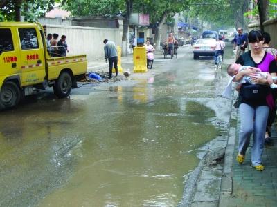 记者在现场看到,在方家营的这处马路上,有一片低洼处,积了不少水,还有水往下水道里淌。有数名供水公司的员工已赶到了现场,准备对路面下的断裂水管进行抢修。一名抢修人员称,这地下的水管离地面不是太深,因为长期的碾压,导致地面下沉,再被大货车一压,管道出现裂缝,水柱冲破地面,冒了出来,他们已将水阀关闭了,目前周围不少居民家已断水。