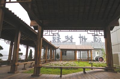 通州区地税局楼顶,设计精美的中式长廊已经建成,成为工作人员休息处,周边种植着大量的花草。
