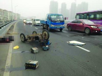 送菜男子骑电动三轮车上高架 被撞车毁人亡