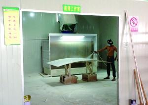 而继续往里走,油漆味越来越浓,记者感觉头越来越沉。在二楼东侧,有喷底漆、定漆两个工作间,工作人员戴着防毒面罩熟练地为木制品喷漆加工。在厂里待了不到5分钟,记者就被油漆味和粉尘熏得受不了跑了出来。
