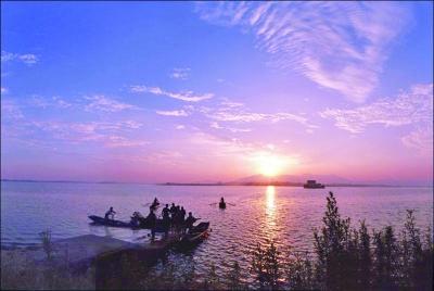 晚霞夕照下,马鞍山美丽的石臼湖。
