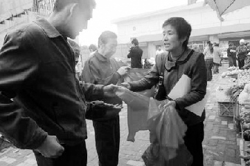 王加福说,她当时在西固公园附近的菜市场卖土豆,左胸佩戴一个西固区委发的“文明礼仪宣讲员”的徽章。一开始,总把家里的面袋子做成布袋,送给周围的人。