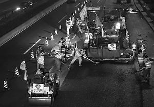 昨天凌晨,工作人员在二环路光明桥路段进行养护施工,为路面新铺一层2.5厘米厚的沥青。本报记者 孙戉摄