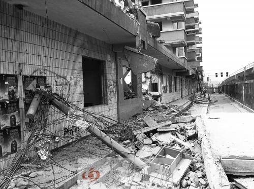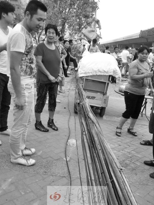 记者发现,砸伤李女士的是一捆通讯线缆,有20多根。这些线缆是被路边在拆的楼房墙壁砸落的,连接线缆的一排水泥线杆,也被线缆扯断,有6根。其中一根断成了三截。小区居民说,当天下午,施工人员用挖掘机拆除这座临街楼时,未在周围拉警戒线。