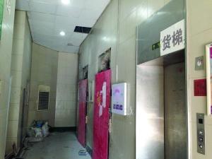 昨天下午,记者来到成贤街沙塘园7号,这是一栋高达33层的居民楼,据周围居民称该居民楼建于1997年。在一楼大厅一共有3部电梯,两部客梯,一部货梯。两部客梯已经停用,而且门口用木板封上了,门口堆了不少建筑材料,上面也都铺满灰尘。