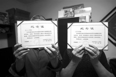 昨日,刘老太和老伴赵先生展示捐献遗体纪念证书,这是他们送给万希润医生的礼物。新京报记者 王贵彬 摄