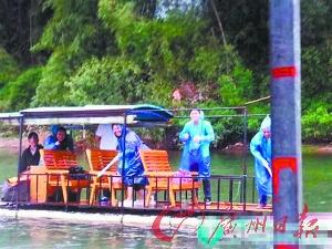 第三张很可能是团友们穿着雨衣游览漓江时的情景。