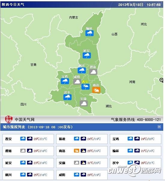 18日(八月十四):全省阴天,陕北北部部分地方有小到中雨,局地有暴雨,关中西部、陕南西部有小到中雨,局地大雨。