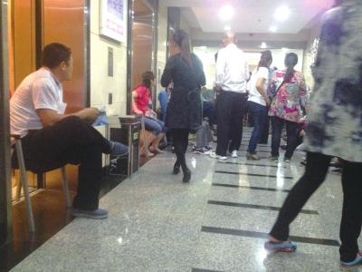 维权的职工坐在10层电梯口。京华时报记者赵思衡摄/视频