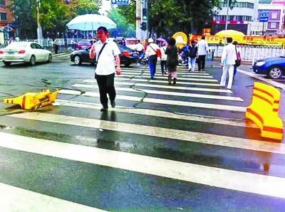 本报报道为了避免掉头车辆横穿人行横道,从而保证行人的安全,潮汐车道在各大关键路口处增加了安全岛。然而还不到一天,小庄路口的安全岛就被撞坏。昨天下午,针织路口处的安全岛也因过往车辆的碰撞被“连根拔起”。此外,部分市民表示潮汐车道上的安全岛外形和其他地方的似乎“不大一样”,看上去有些“太过简陋”。