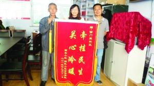 摄影 李子涵 居民把锦旗送给西门里社区工作人员(中)表示谢意。