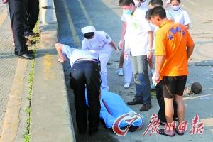 昨日鱼珠码头,男子被打捞上来时已经死亡。记者杨耀烨 摄