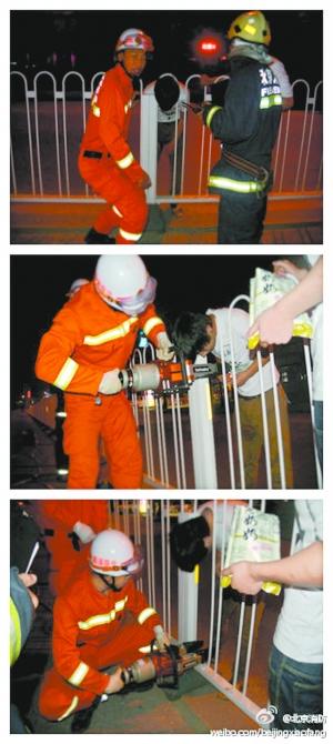 “打个赌吧,谁能把头钻进护栏里,还能再褪出来,谁就算赢。”没想到,头是钻进去了,却再也褪不出来了。这不是小孩子玩的游戏,是两个年轻男子昨天凌晨打的赌,赌注就是一顿夜宵。所幸,朝阳消防员迅速赶到了,用专业设备将护栏撑开,救出这名卡头男子,也结束了这场危险的游戏。