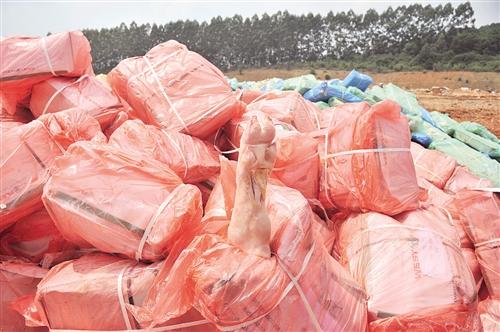 一批猪脚(小图)等走私冻品被推坑填埋处理 本报记者 宋延康 摄