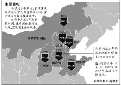 《实施细则》主要针对北京、天津、河北、山西、内蒙古、山东六个省份。具体指标:到2017年,京、津、冀PM2.5浓度在2012年基础上下降25%左右,晋、鲁下降20%,内蒙古下降10%。北京PM2.5需控制在60微克/立方米左右。